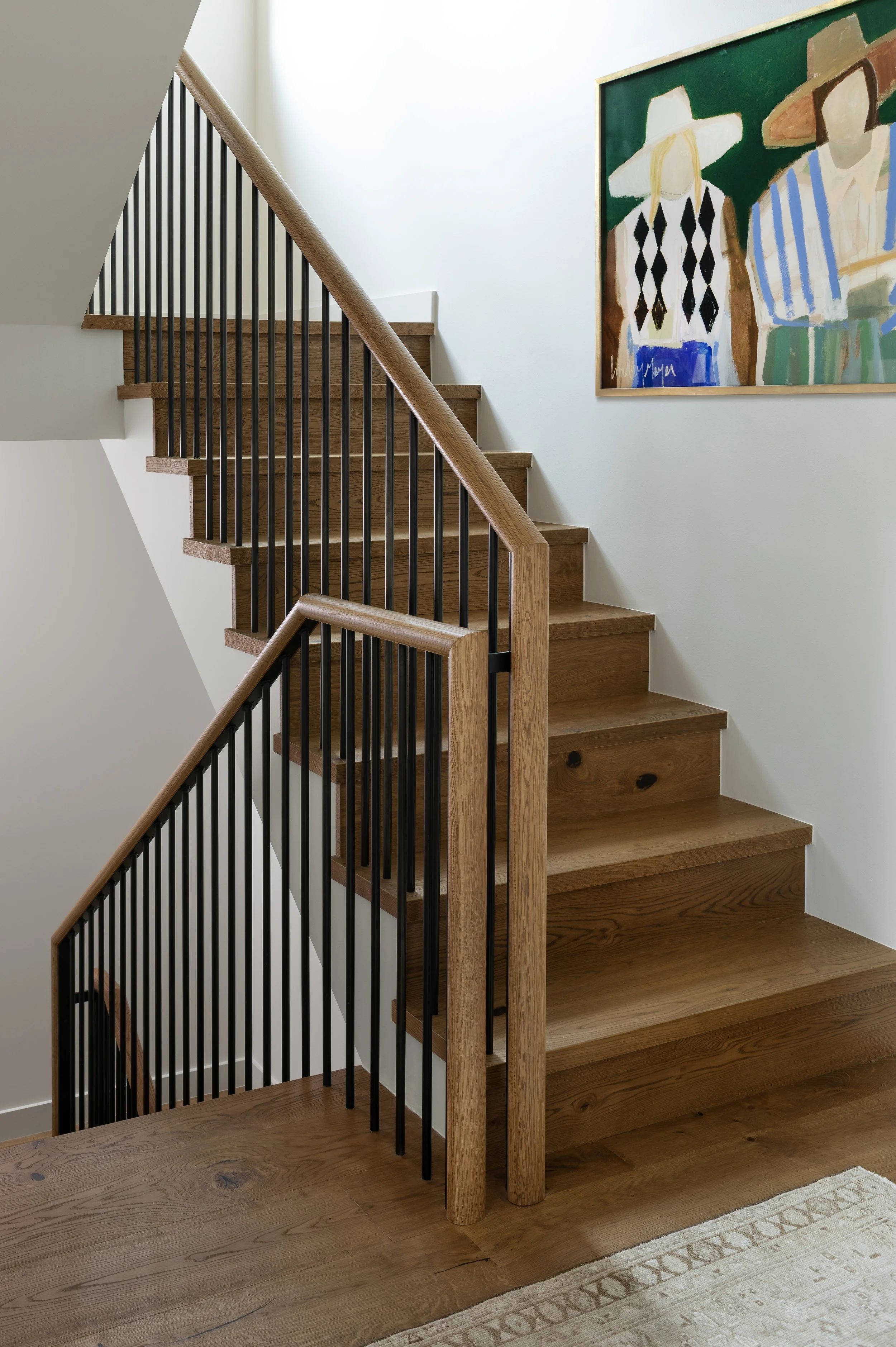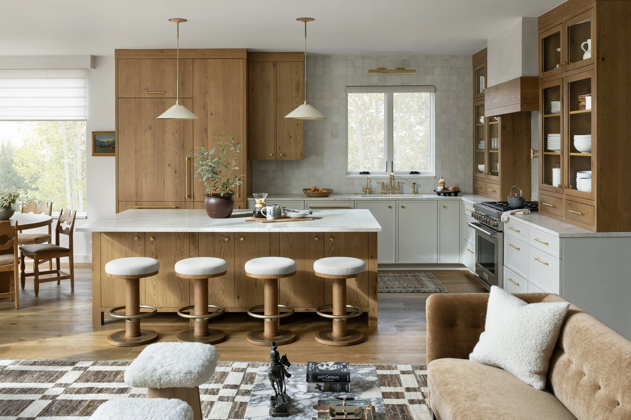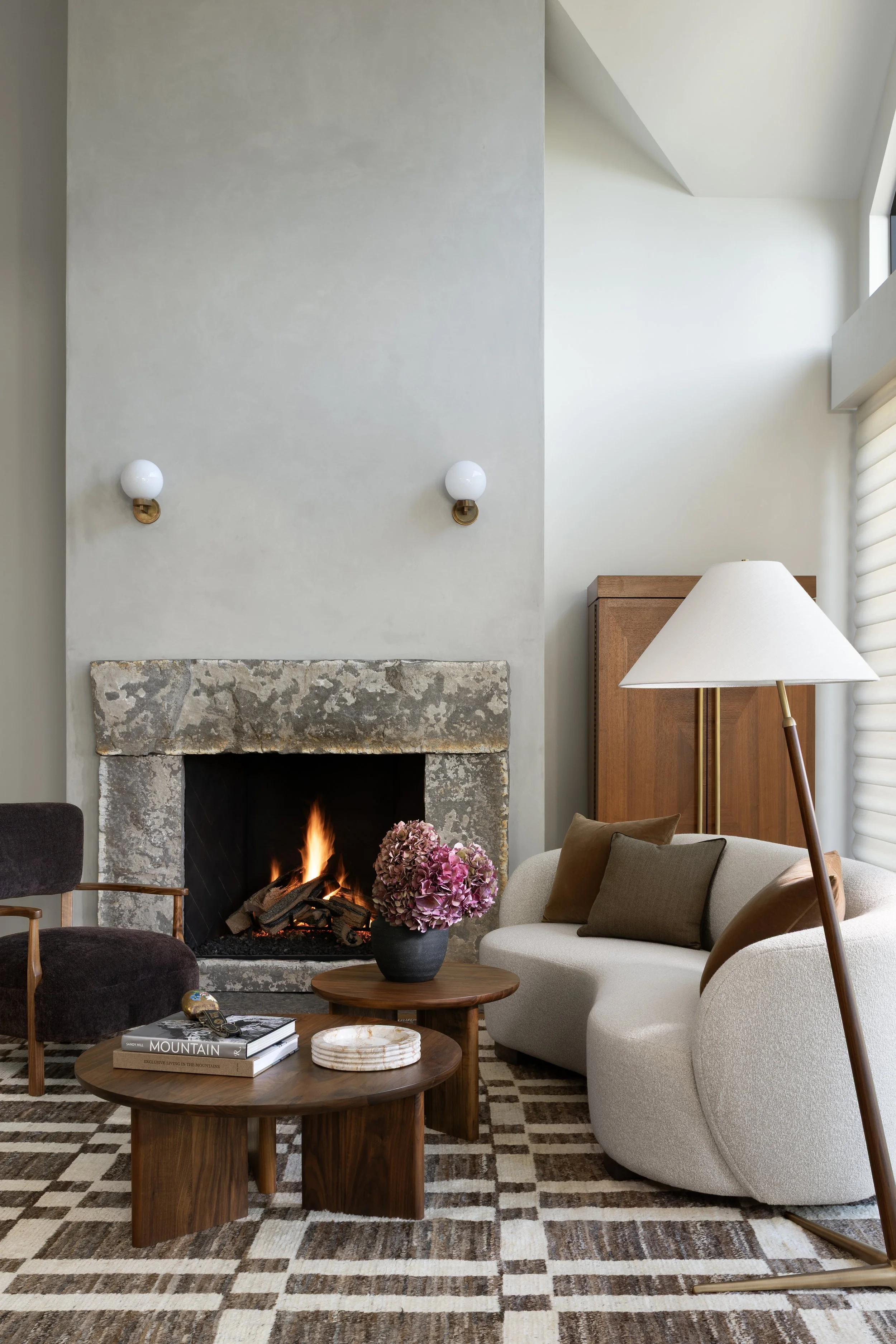 This project blends modern softness with natural, grounded materials. A tall plaster fireplace anchors the space, paired with a hand-carved stone surround for warmth and texture. Natural light highlights the soft palette and craftsmanship throughout, resulting in a calm, modern mountain retreat.